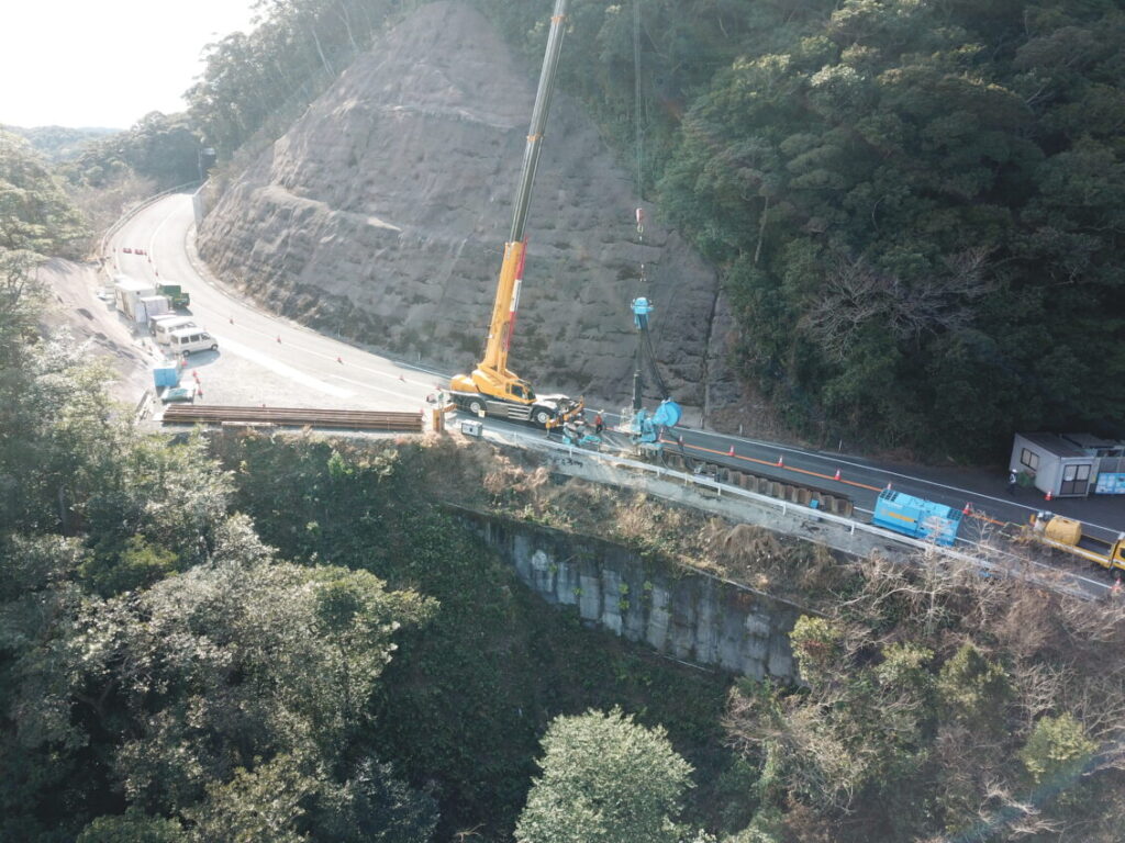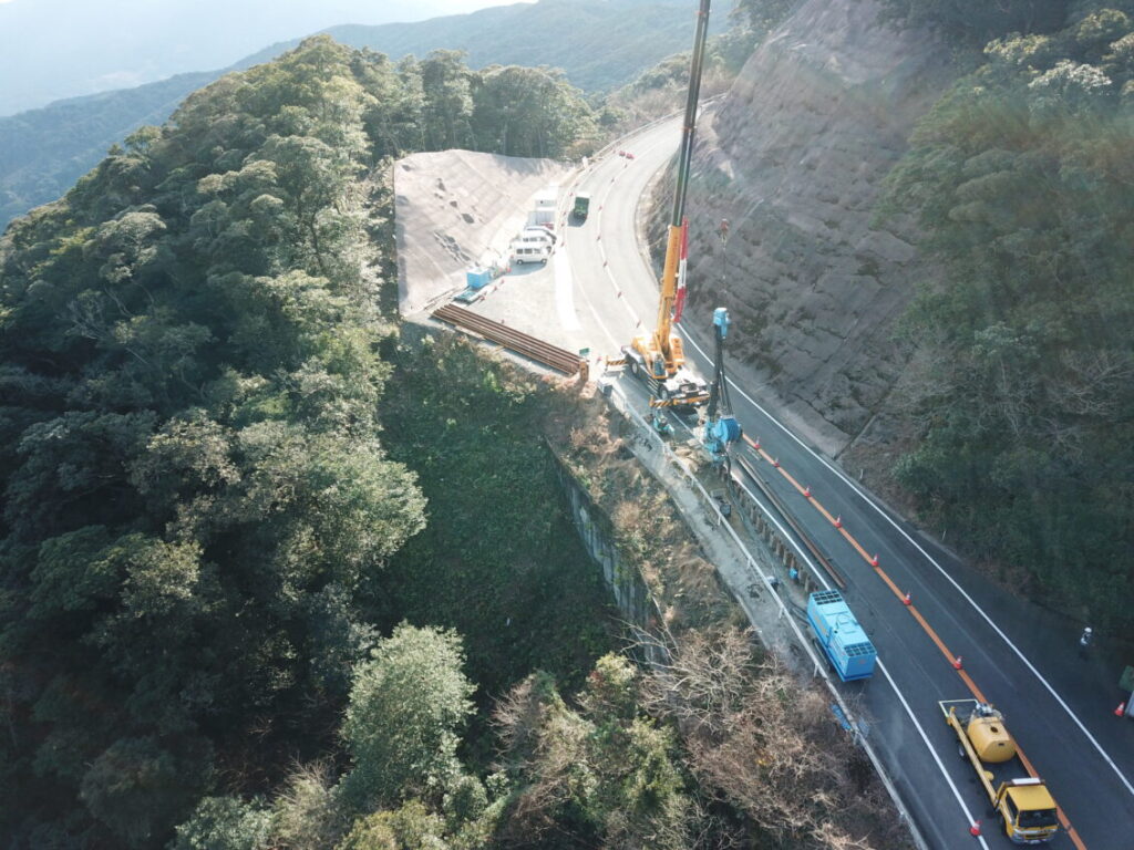 指宿有料道路(Ⅱ期)線形改良工事(R6-1工区) 1月の工事進捗状況です。 2026.02.04 指宿有料道路(Ⅱ期)線形改良工事(R6-1工区) 1月の工事進捗状況写真です。 1.空撮全景直上 2.空撮全景(起点側から終点側) 3.空撮全景(終点側から起点側) 4.空撮全景(施工箇所)