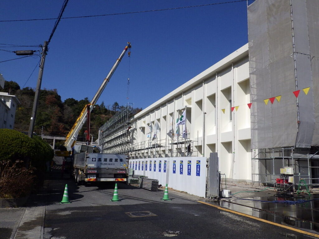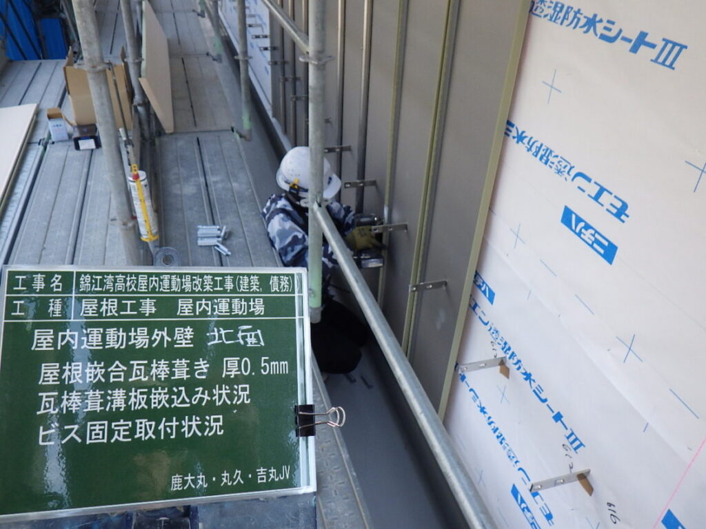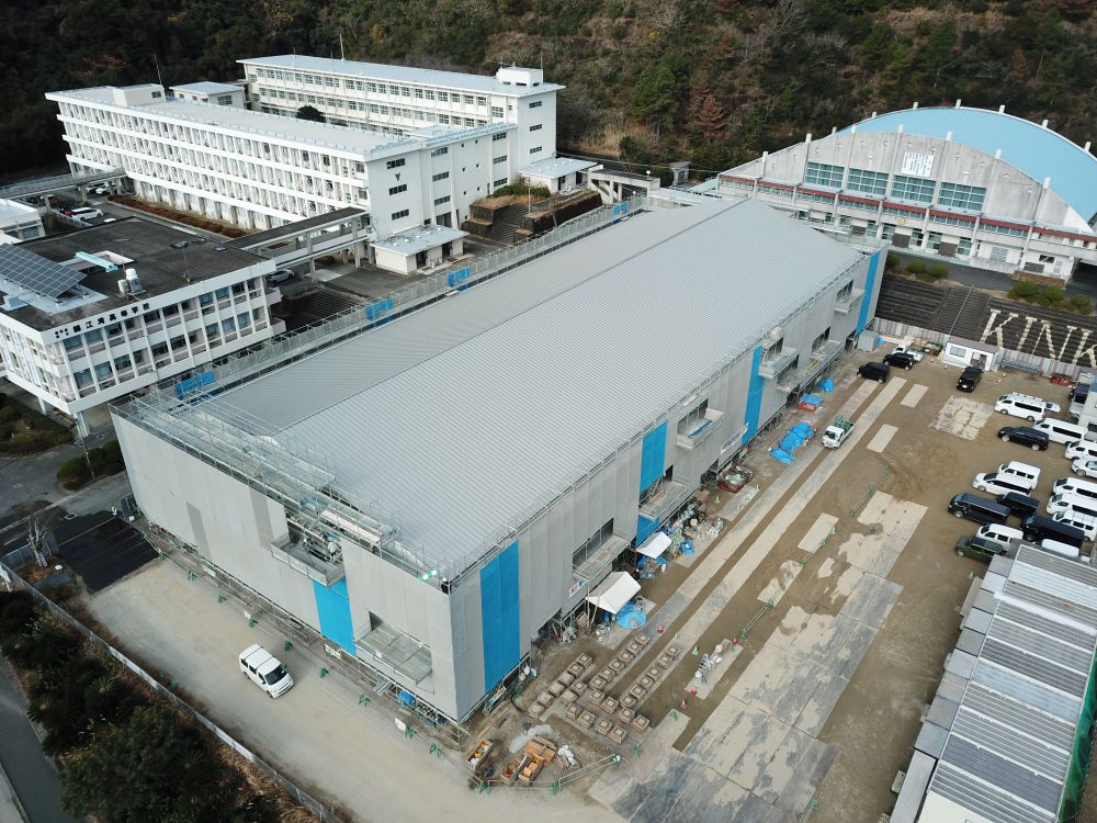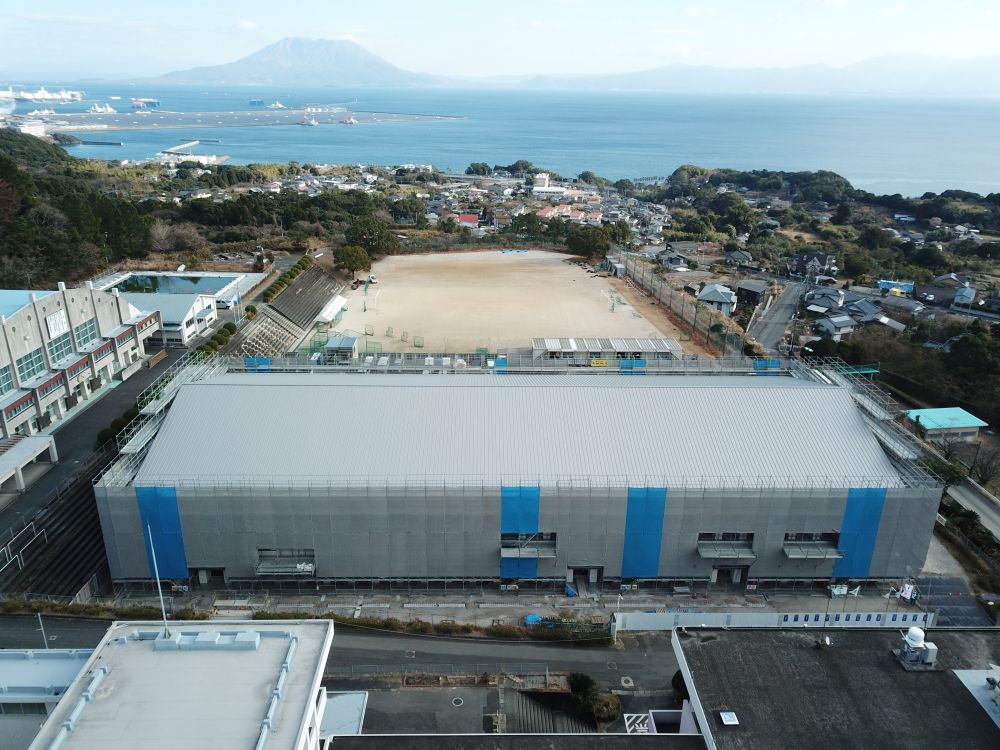錦江湾高校屋内運動場改築工事(建築、債務)の1月末工事進捗状況です 2026.02.06 錦江湾高校屋内運動場改築工事(建築、債務)の1月末工事進捗状況写真です 進捗率74.1% 1.空撮全景 2.空撮全景 3.R階内部軽量鉄骨下地組完了 4.北面外壁仕上げ張り状況 5.西側外部足場解体状況